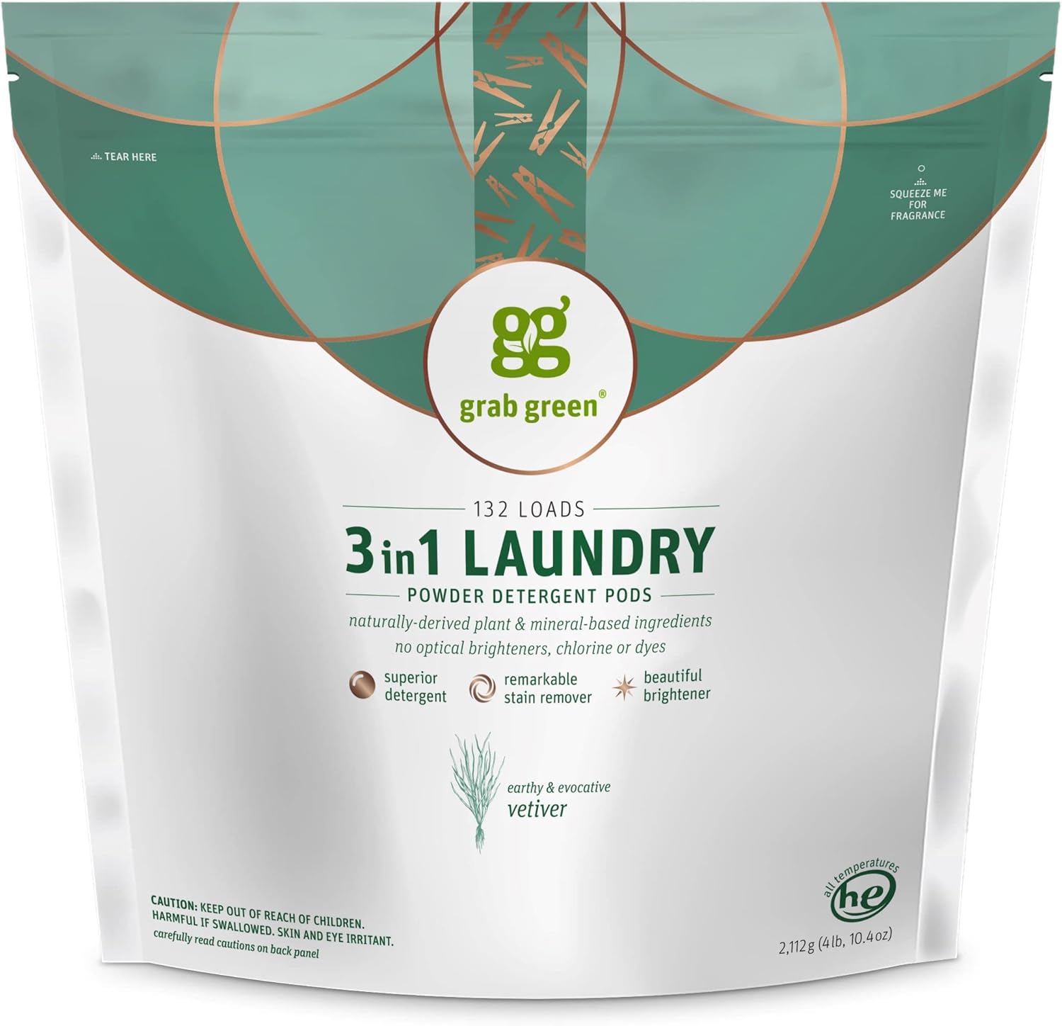 • Contains: 1- 132 Pod Bag of Grab Green Natural Vetiver 3in1 Laundry Detergent Pods. Our velcro closure bags are convenient and easy to use, no hassling with frustrating zip closures