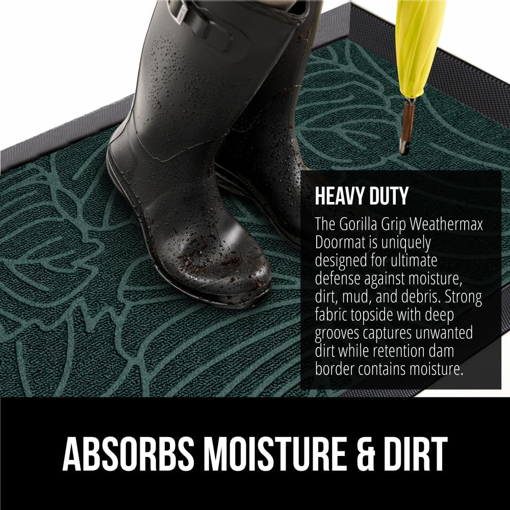 GORILLA GRIP 100% Waterproof All-Season WeatherMax Doormat 35x23, US Designed Natural Rubber, Stain and Fade Resistant, Low Profile Indoor Outdoor Door Mats, Easy Clean Patio Mat, Green Palm