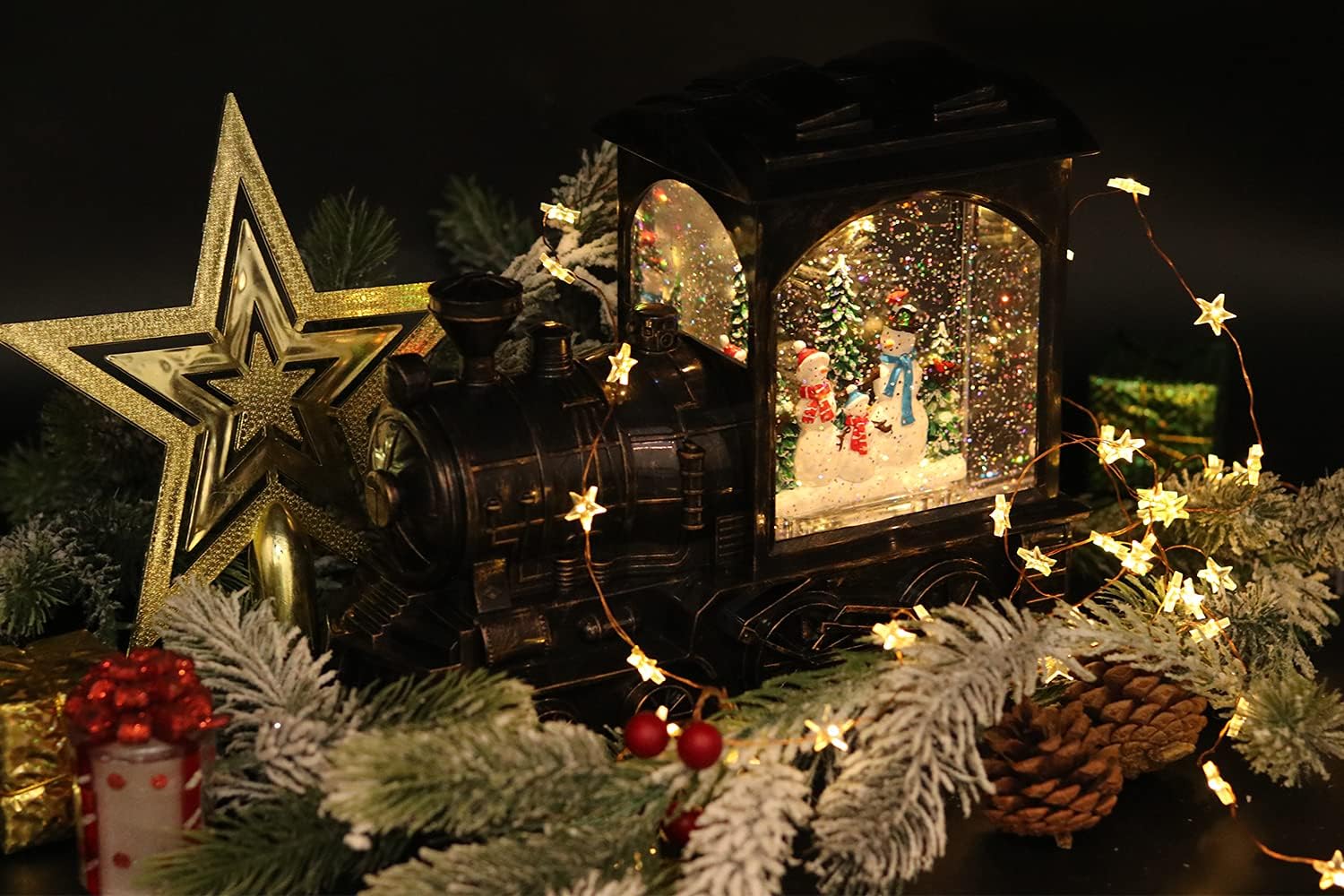 • CHRISTMAS DESIGN: This train snow globe lantern inside the snow globe features Caroling Snowmen and evergreen trees with a gold star. It will be a good decoration for your party, can create an unforgettable memory for you.
