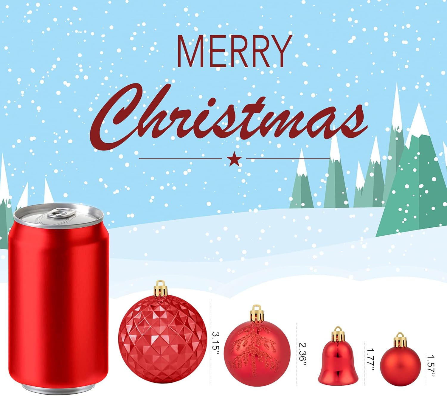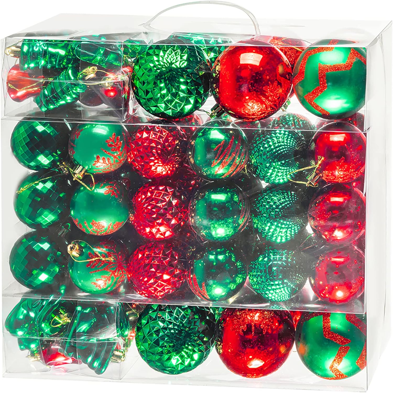 • 【Christmas Ball Ornaments】 This green and red Christmas ornament set contains 116PCS of Christmas balls in 18 styles, includes various shapes, sizes, such as 1.57” / 2.36” / 3.14” Christmas ball, stocking , bell, and gift. It's your call to complete your Christmas decoration with these beautiful balls ornaments set, and make the Christmas season more memorable and unique