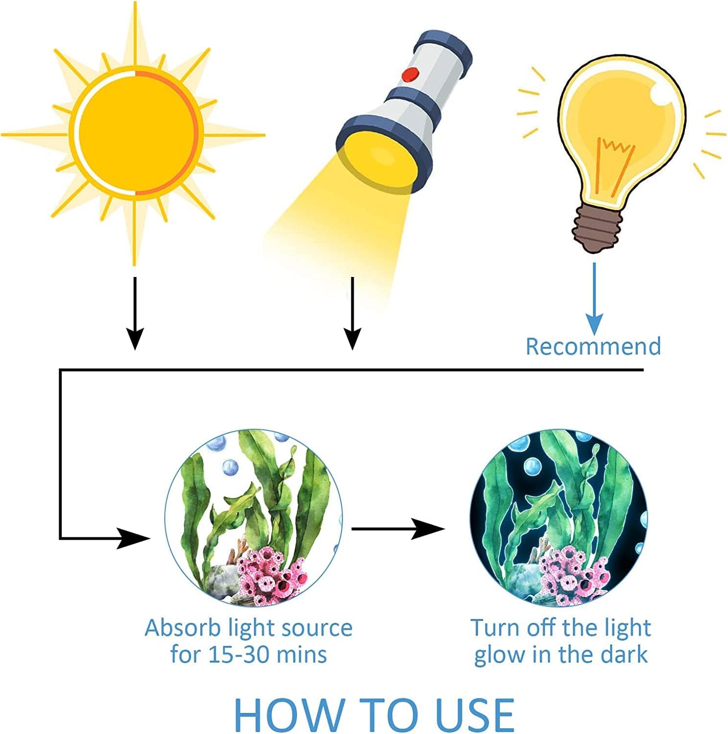 • 🐟【Super Bright and Lasting Glow】Just put it under the light or sunlight for 10-20 minutes before use, and it will glow in the dark for 8-10 hours, making you feel like you are in the underwater animal world. The longer it absorbs light, the longer it stays with you at night. Use a flashlight or cell phone light for better results.