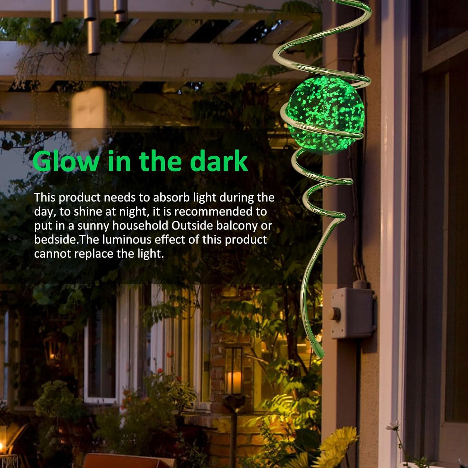 • 【Unique Visual Illusion Spiral Design】The gazing ball spiral tail is an unique hanging ornament ,Also it can help to stabilize 3D wind spinners or yard decor from swing when it rotate.When the spiral tail rotates to the left, the glass ball seems to move upwards,when the spiral tail rotates to the right, the glass ball seems to moves downward,the glass ball seems to like floating and dancing in air, presenting a magical optical illusion!It doesn't shine in the daytime,It needs to glow in the dark.