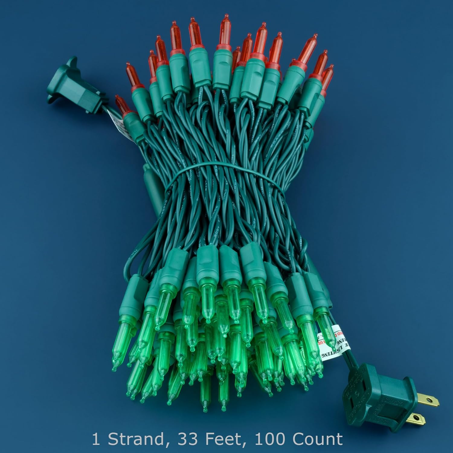 • SPECIFICATIONS ☀ Each pack contains 1 strands of one-piece string lights, total length 33 feet with 100 count red-green interval mini lights. 22 AWG green cord, 4" lead, 4" spacing, 4" tail.