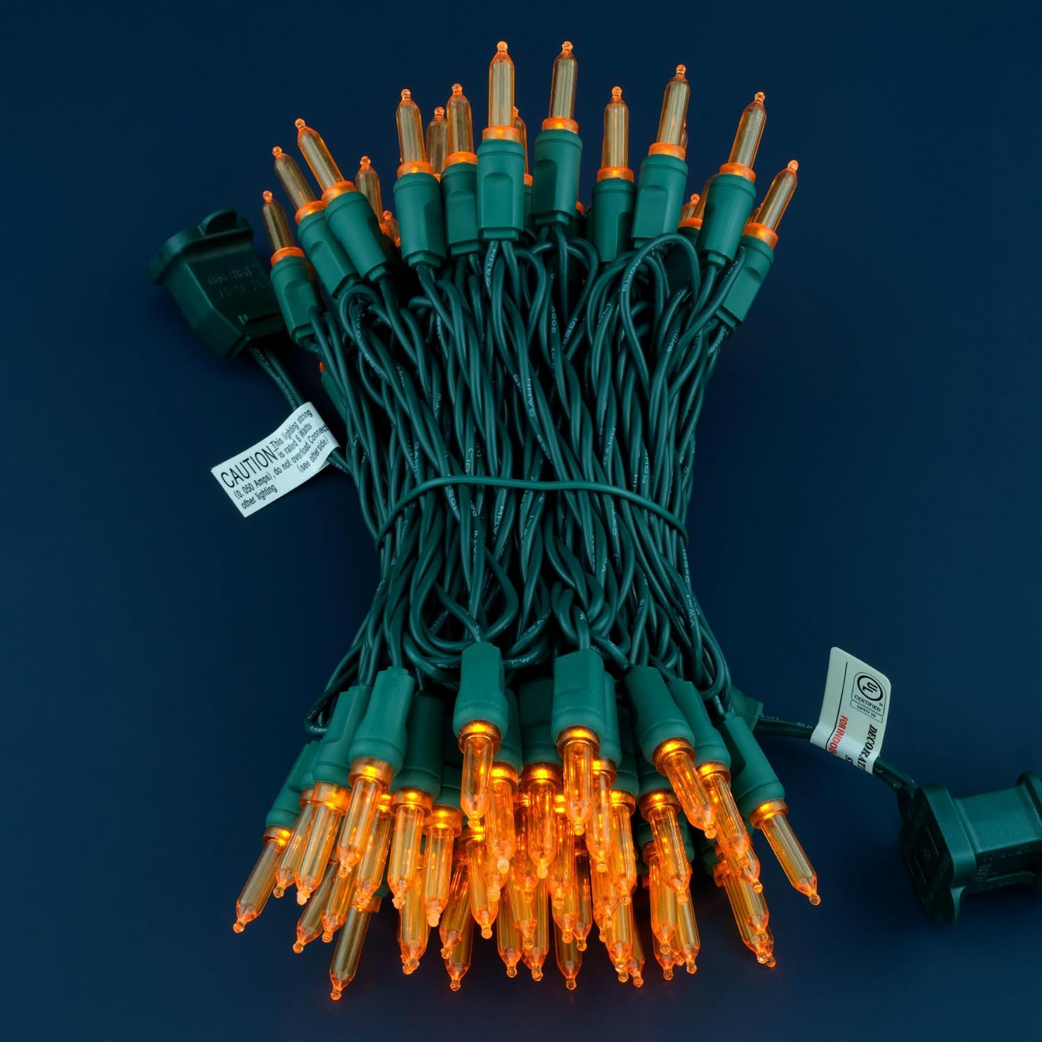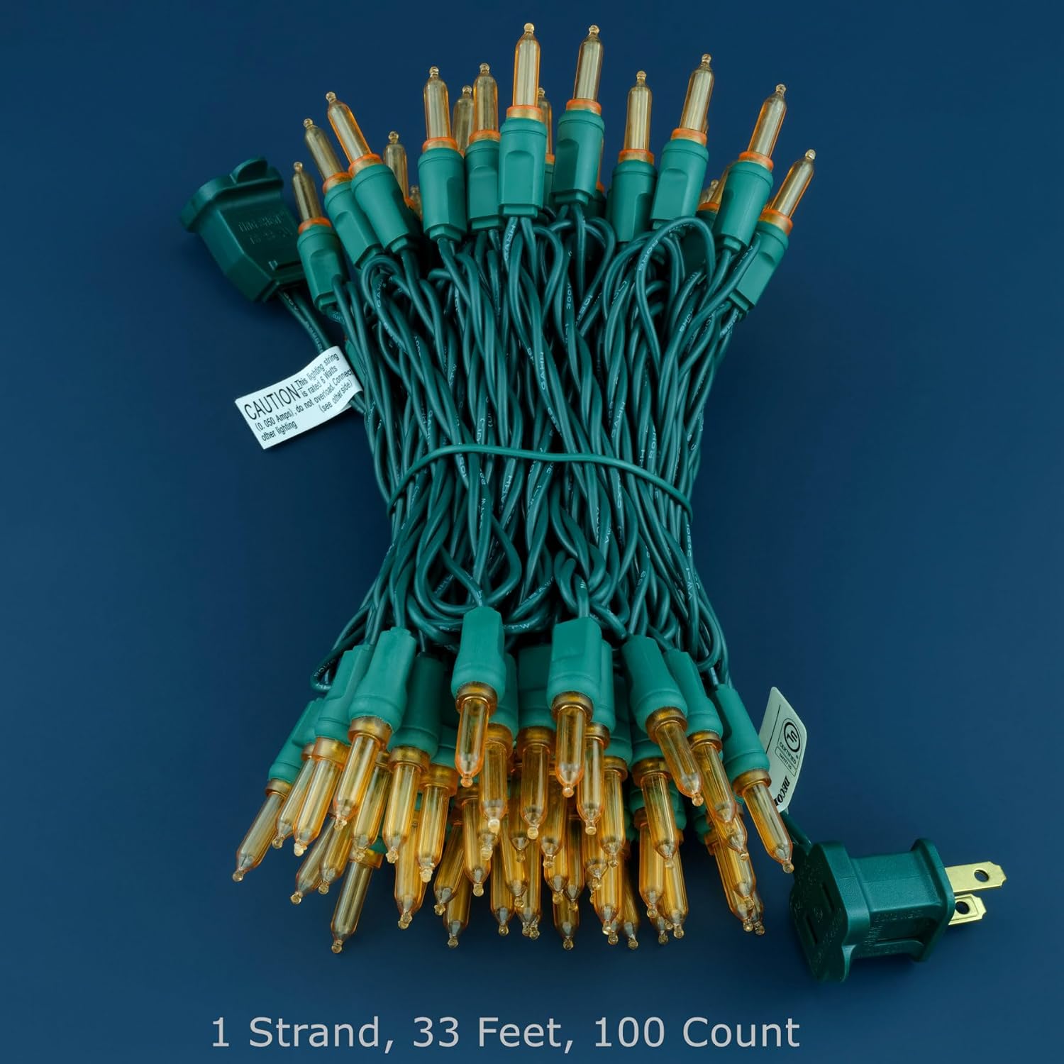 • SPECIFICATIONS ☀ Each pack contains 1 strands of one-piece string lights, total length 33 feet with 100 count orange mini lights. 22 AWG green cord, 4" lead, 4" spacing, 4" tail.