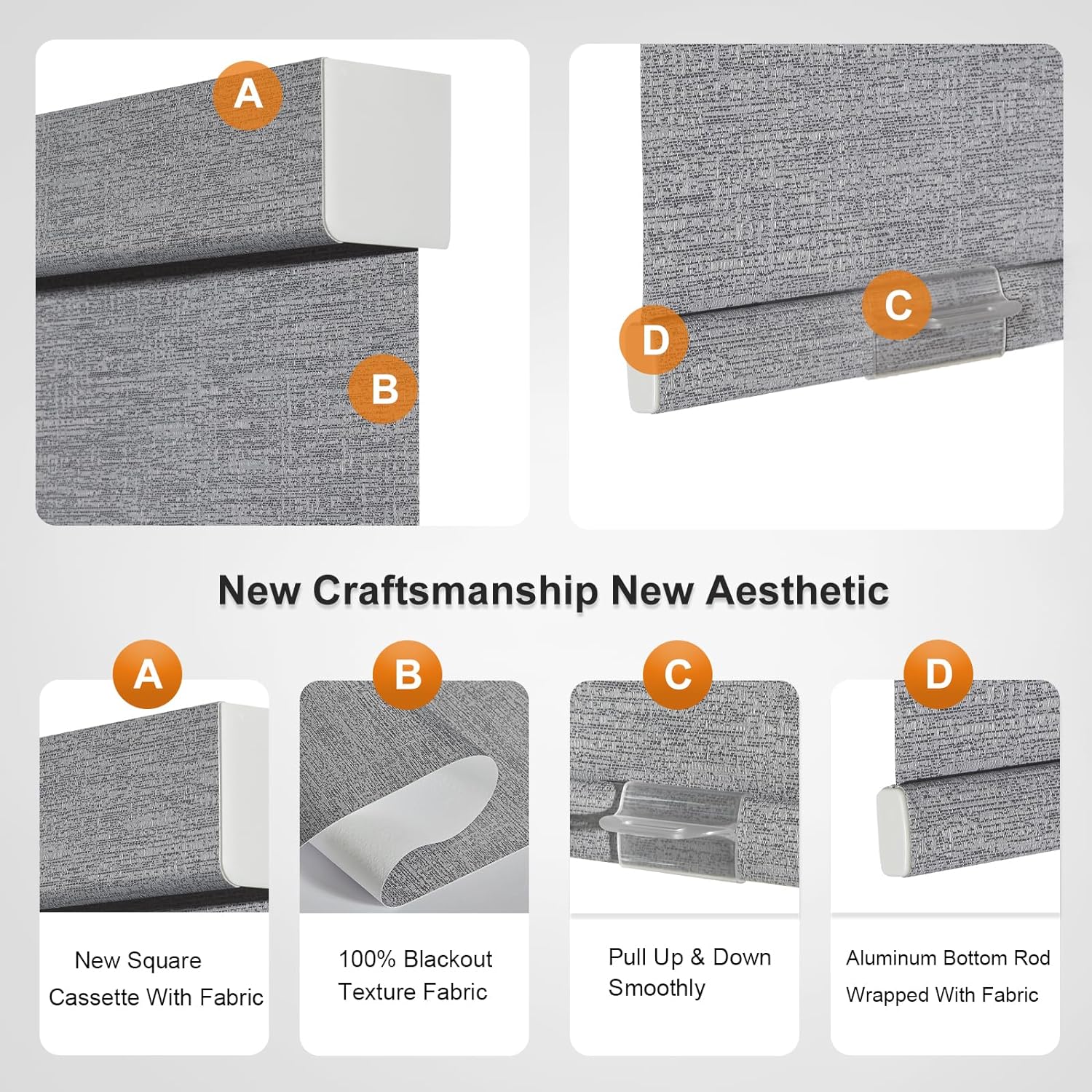 • [FEATURES]: Cordless window blinds with Free Stop & Single jacquard roller features. Enjoy Clean looking & Child Safety with Cordless Pull down shades for windows. A handle at the bottom bar enables you to stop the shade at any state you want. Polyester imported, blackout, suitable for any room that needs blackout function, good ventilation. Easy for installation.