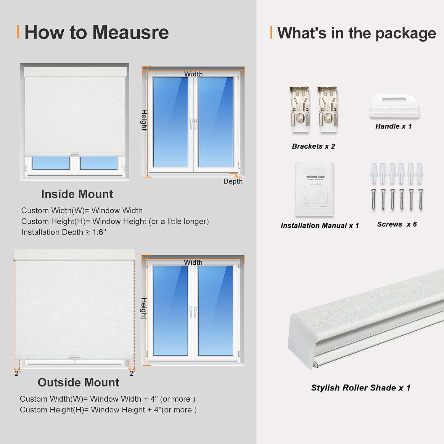 • [HOW TO CHOOSE THE CORRECT SIZE OF BLIND]: FOR INSIDE MOUNT: Choose the width of blind the same as the window, it is okay to choose a height slightly higher than the window. FOR OUTSIDE MOUNT: Based on the size of your window, we recommend you to plus at least 4" to its width and height, that is, add 2" on each side of the window. [PLS Note] Fabric width will be 0.94" shorter than the size of the shade.