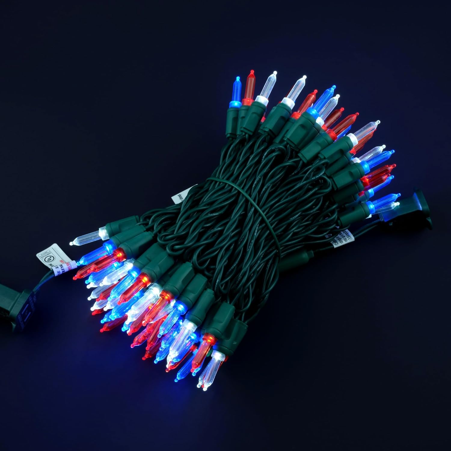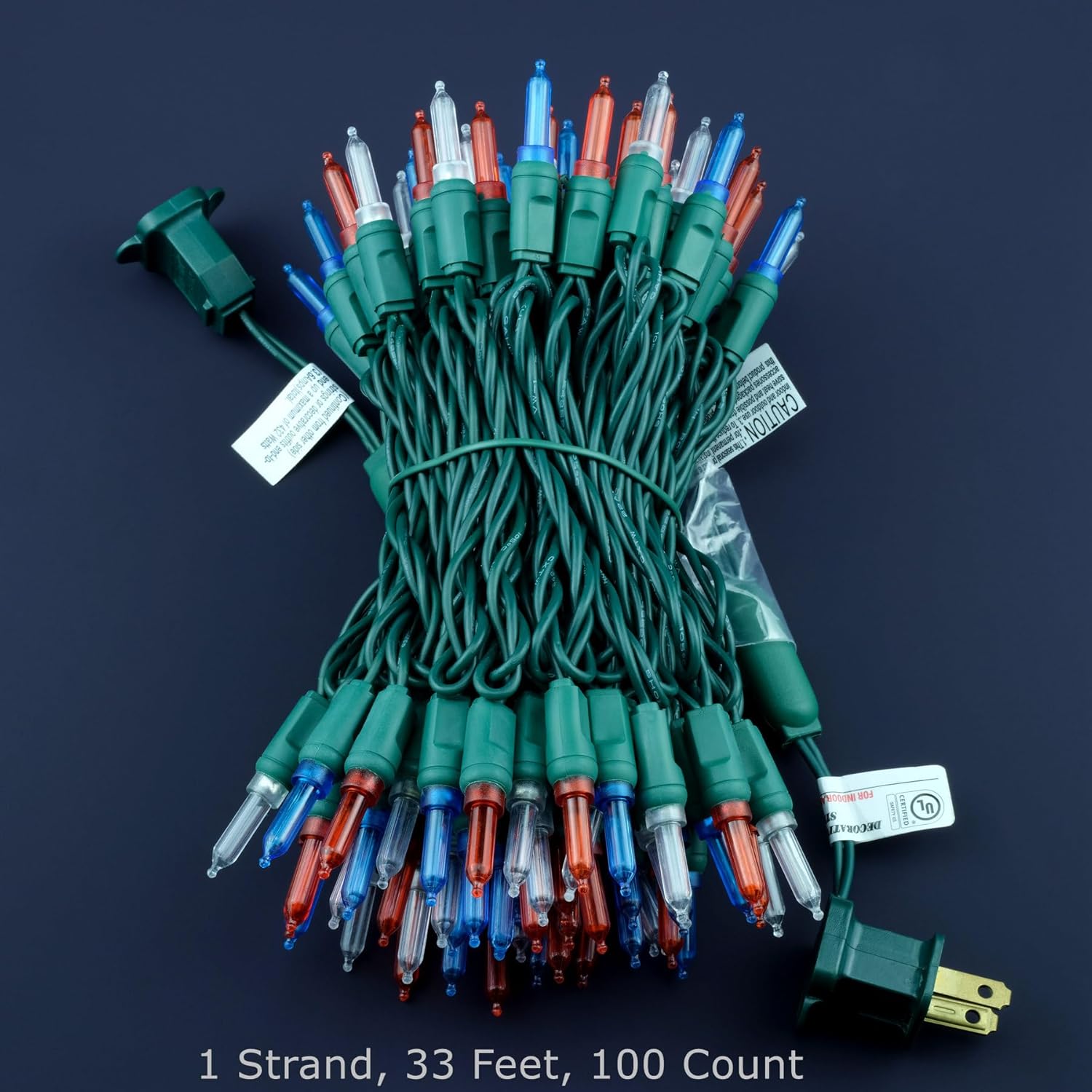 • SPECIFICATIONS ☀ Each pack contains 1 strands of one-piece string lights, total length 33 feet with 100 count multicolor mini lights. Three colors of light bulbs are spaced out, they are red, white, and blue. 22 AWG green cord, 4" lead, 4" spacing, 4" tail.