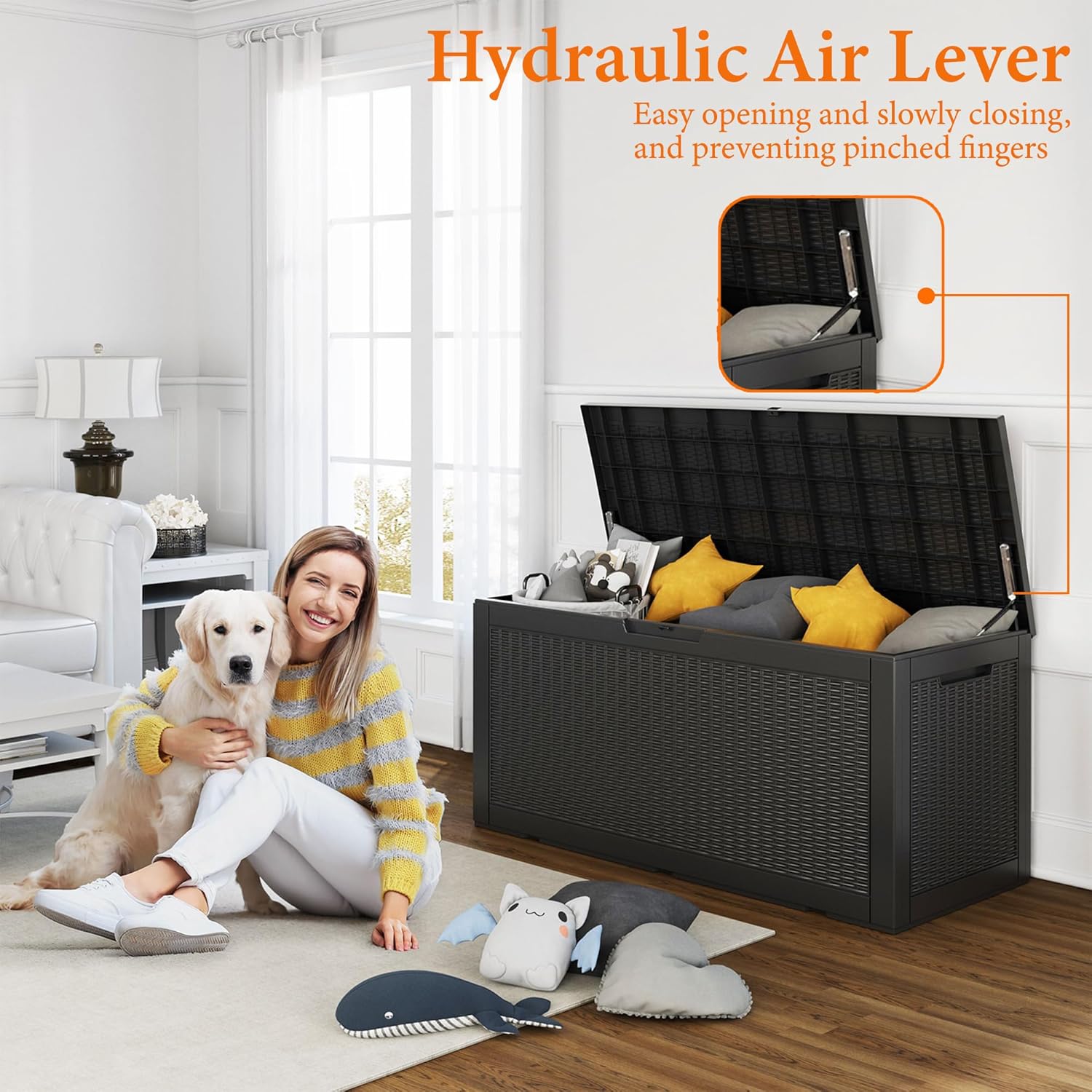 • Weatherproof material: This deck box is made of environmentally friendly polymer resin. It has better water and UV resistance than traditional wood. There is no need to worry about it fading and falling off in the coming years. Years of virtually no maintenance are required.