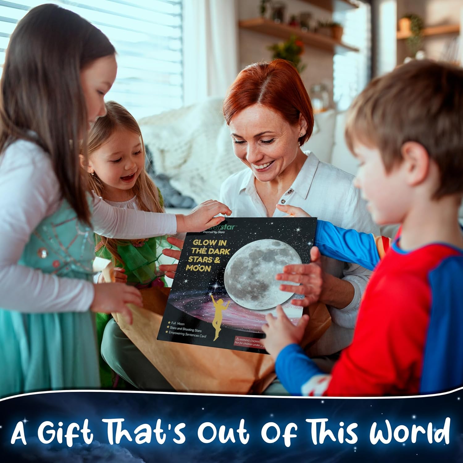 • A GIFT THAT’S OUT OF THIS WORLD – Looking for the perfect gift for boys or girls, Halloween, Christmas? - Liderstar’s glowing stars kit. In addition to 200 brilliant stars and shooting stars, we’ve included full moon , and a FREE affirmation card to build strong bonds, foster healthy relationships. And to top it off, the entire set arrives in a beautiful old record style package, making it the perfect present for stargazers and curious spirits of all ages