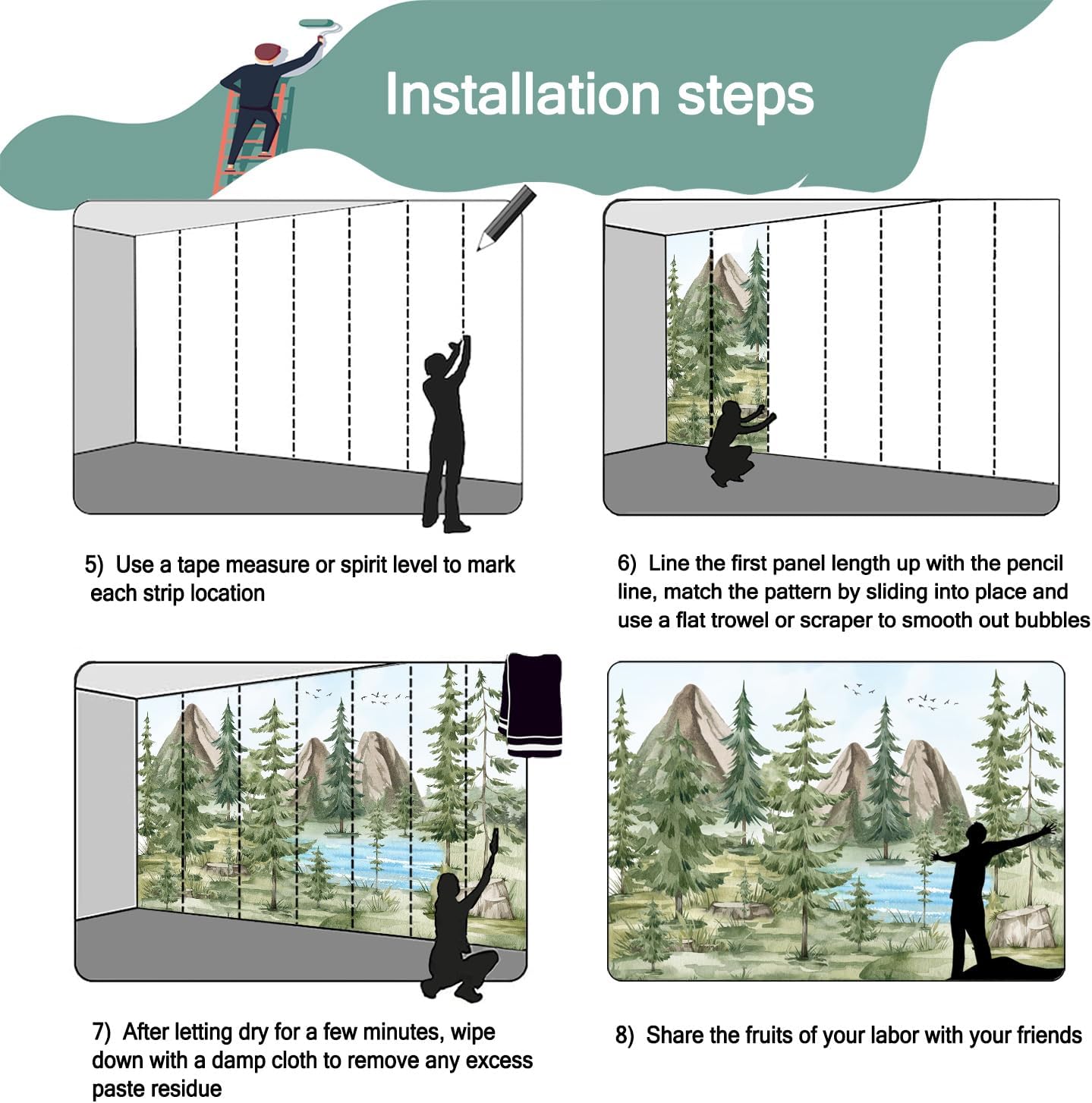• Mural wallpaper size: 100 "W x 65 "H, divided into 5 sections, each section is labeled with a number underneath, there is no need to overlap the pattern when installing, just install according to the number labeled underneath the panel