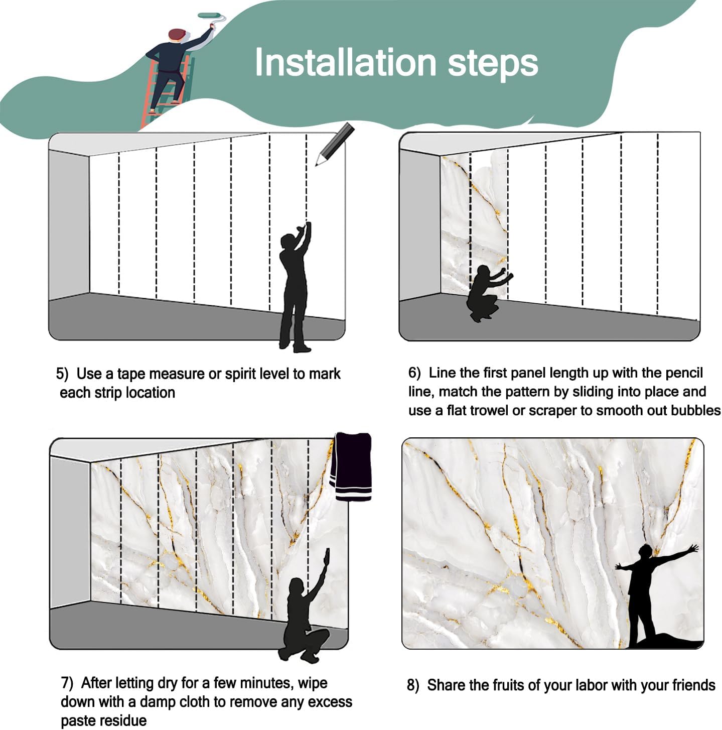 • Mural wallpaper size: 100 "W x 65 "H, divided into 5 sections, each section is labeled with a number underneath, there is no need to overlap the pattern when installing, just install according to the number labeled underneath the panel