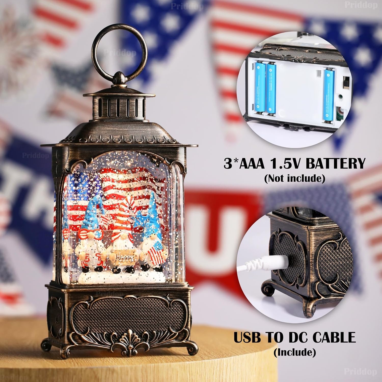 • Gnome Snow Globe: The lantern has three gonme wearing 4th of July shirts, with the American flag. Add some joyful atmosphere to your 4th of July.