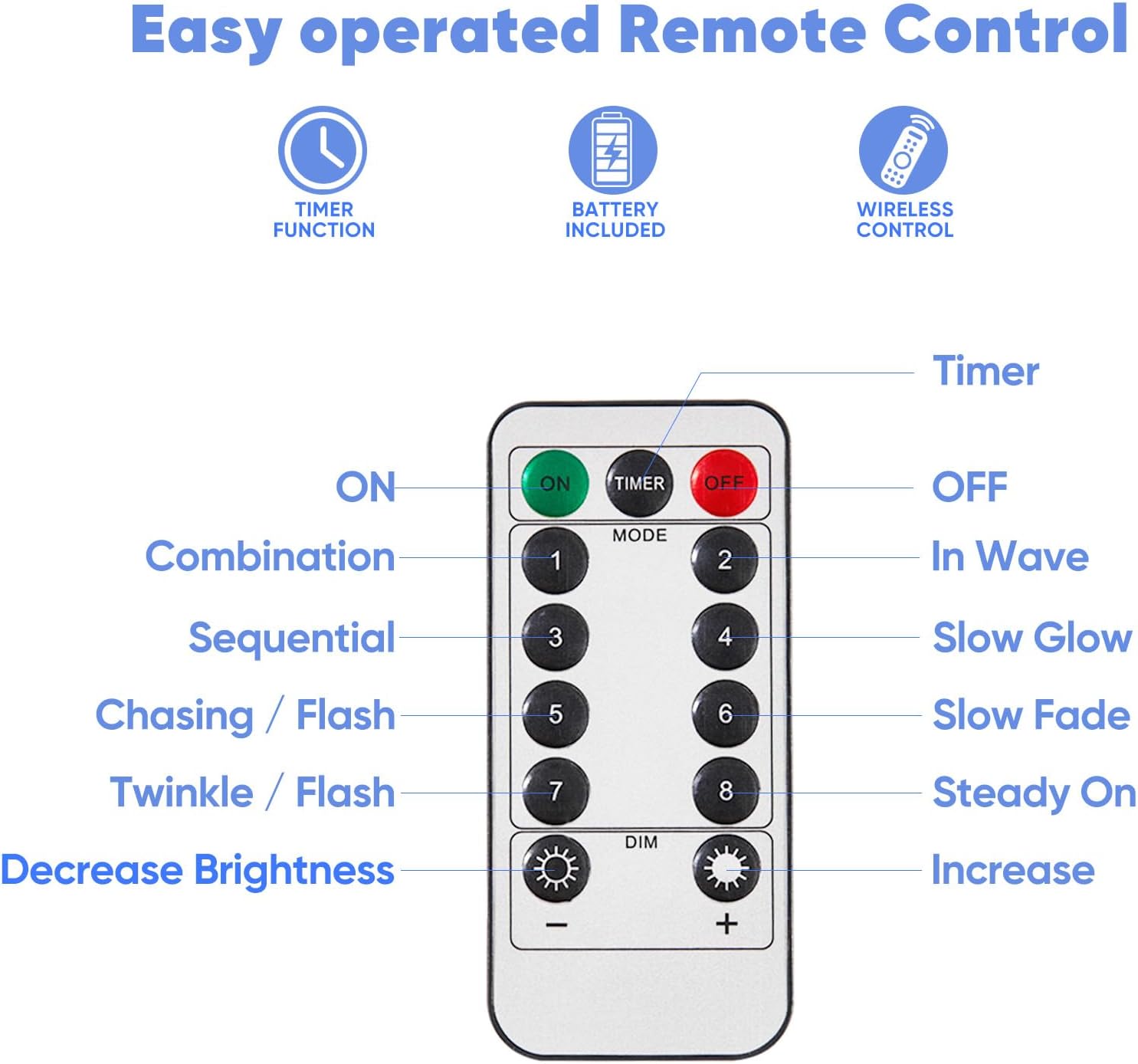 • Remote Control Convenience: Easily switch between 8 unique lighting modes and adjust brightness with the included remote; features timer for automatic 6 hours on, 18 hours off cycle.