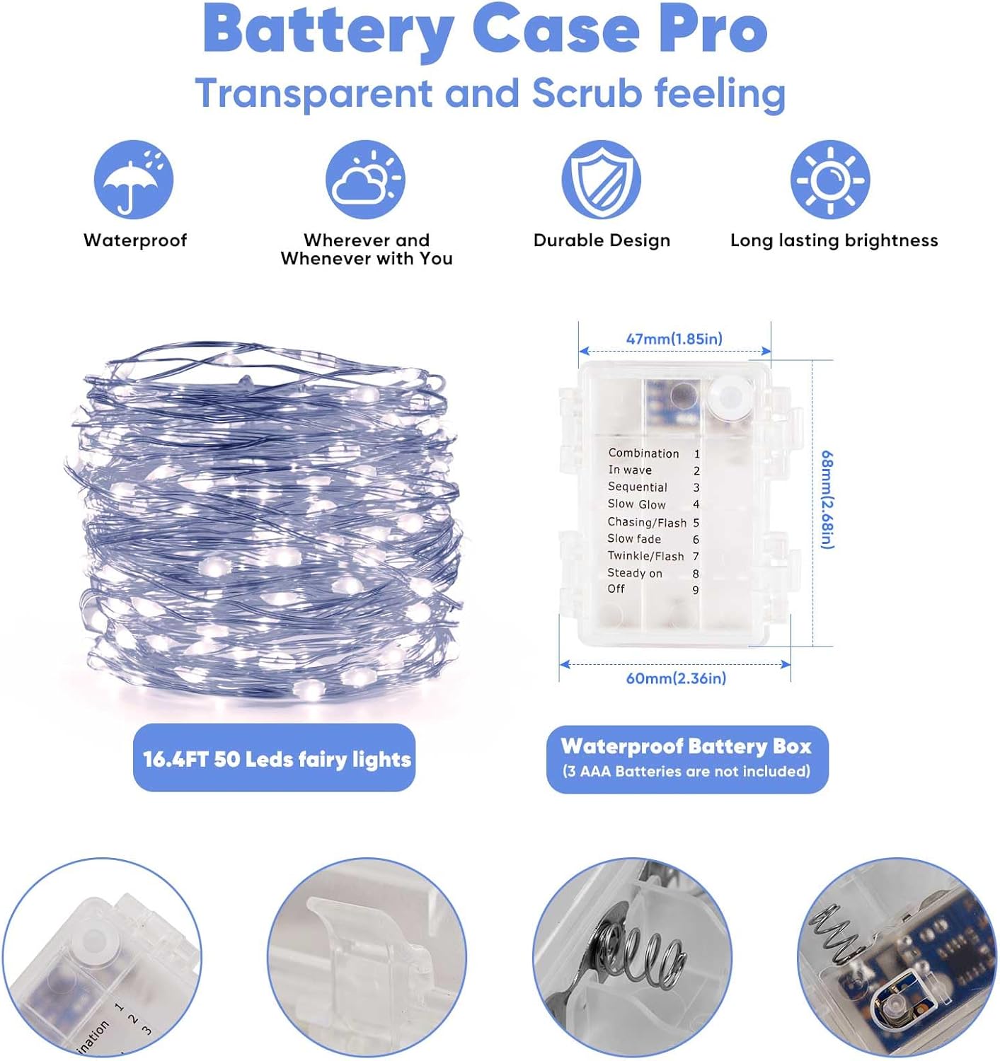 • Weatherproof Design: IP44 rated waterproof battery box and rubber-sealed string lights endure any weather, making them perfect for outdoor decoration.