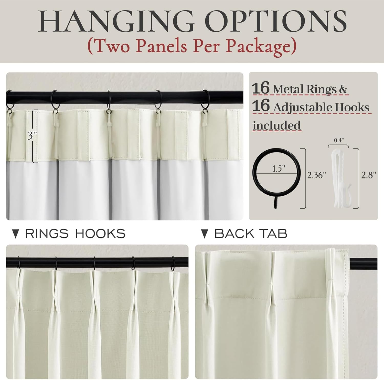 • Ready Made:Set of 2 pinch pleated curtain panels per package with 16 metal rings and 16 adjustable plastic hooks(The adjustable hook can raise and lower the height of the curtain by 1 inch),Each panel measures 40"W x 102"L,pair measures 80"W x 102"L