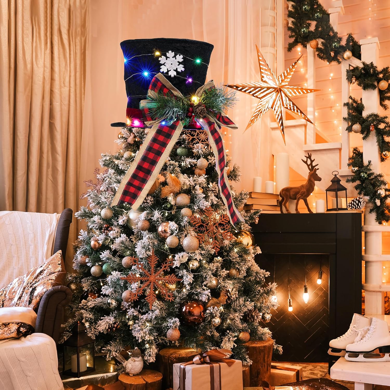 • 【Pretty Bling Christmas Tree Top Hat】: This top hat is not just an ordinary tree topper; it's a dazzling spectacle with built-in glowing that cast a warm and inviting glow. This luxurious top hat is made from a blend of soft velvet, polyester, and plush materials, coupled with metal accents. Its sophisticated design and intricate details make it a standout piece, adding a touch of elegance to your winter celebrations throughout the season.