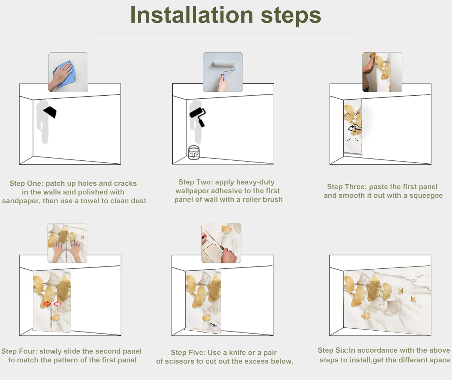 • INSTALLATION - 1.Fill in all cracks or holes and clean dust dirt and grease on the wall surface. 2. Apply the heavy duty wallpaper paste on the wall not mural. 3. Use a spirit level to mark first strip location. 4. match the pattern by sliding into place. 5.use a scraper to smooth out bubbles press. 6. Let dry for a few minutes and that's it! Please Note: Not self-adhesive. We recommend to use a standardized fleece wallpaper paste.