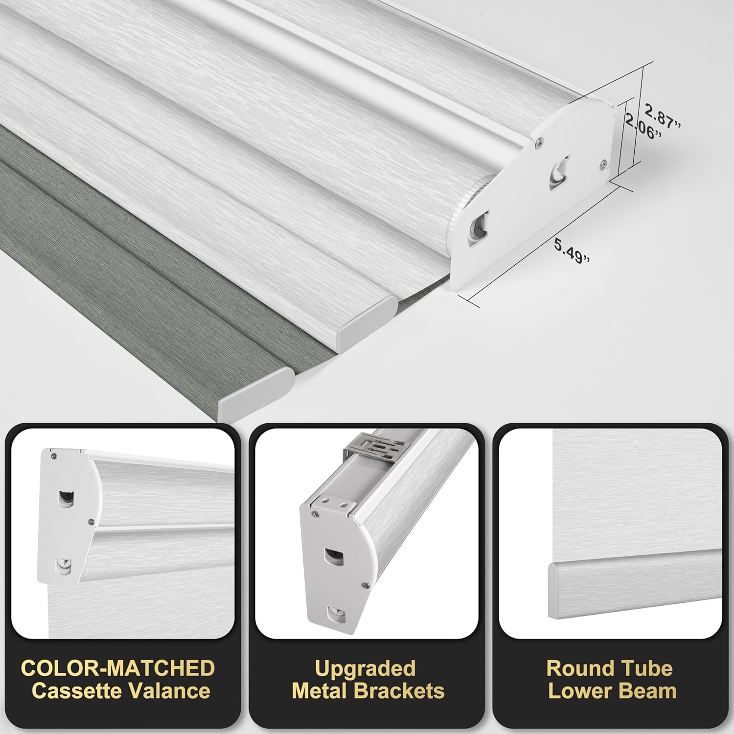 • FREE STOP CORDLESS SYSTEM:The cordless double roller shade prioritizes safety with a cordless design designed for families with small children or pets.You just need to pull down or push up to stop at any position you want. COLOR-MATCHED CASSETTE VALANCE:The hidden installation of the cordless roller blinds can effectively reduce installation gaps, reduce light leakage.The color of the cassette valance is same as the fabric color,making the day night blinds more beautiful after installation.