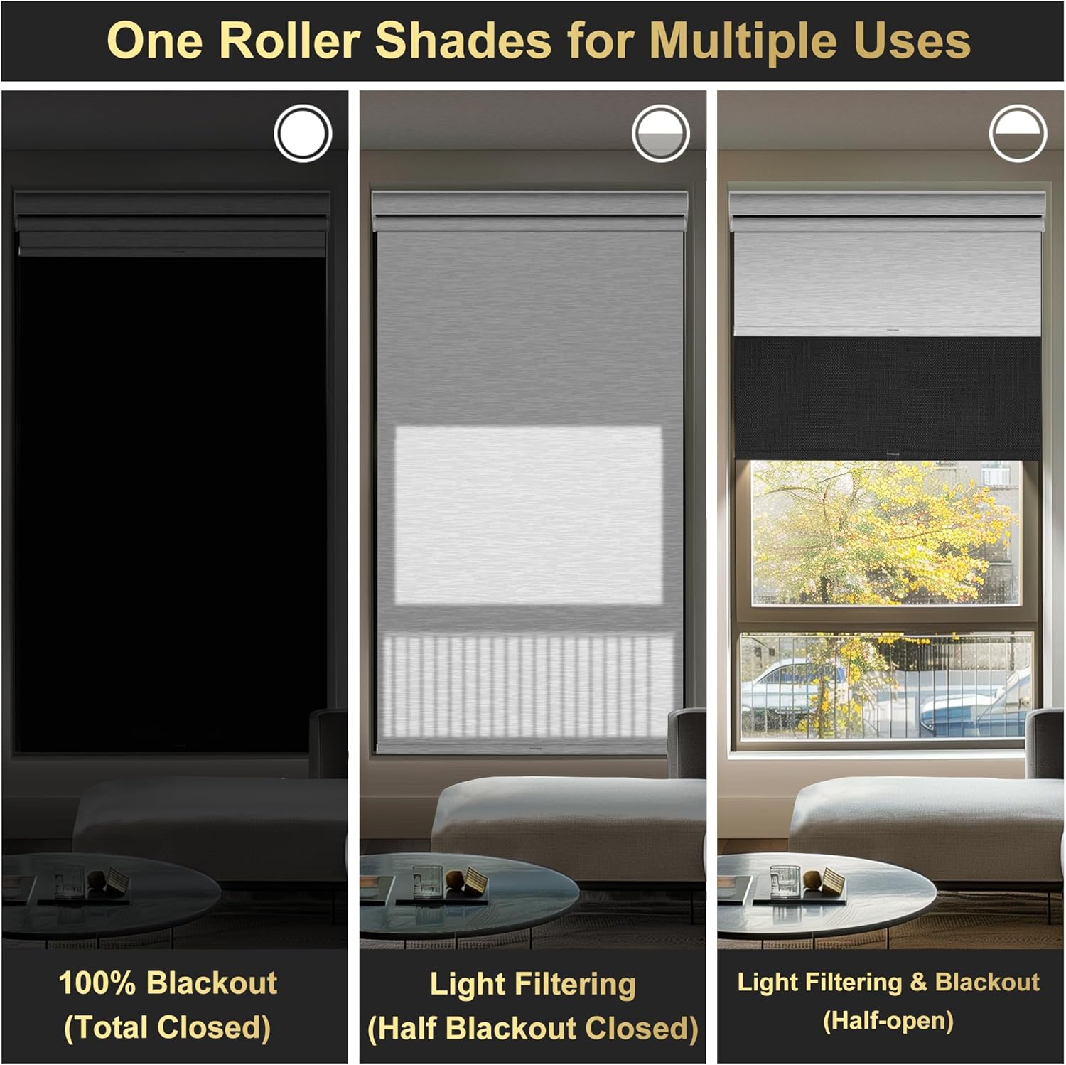• MULTI-PURPOSE SHADE:Dual roller shades consisting of blackout and light filtering shades, blackout roller shade can 100% blackout,thermal insulation and UV Protection,so that you can experience quiet and comfort of the night during daytime;Light filtering roller shade allow light to filter into your room,and no glare,soft diffused light allow for perfect balance of light and darkness,and also enhances overall aesthetics of your home,allowing for a romantic and comfortable living environment.