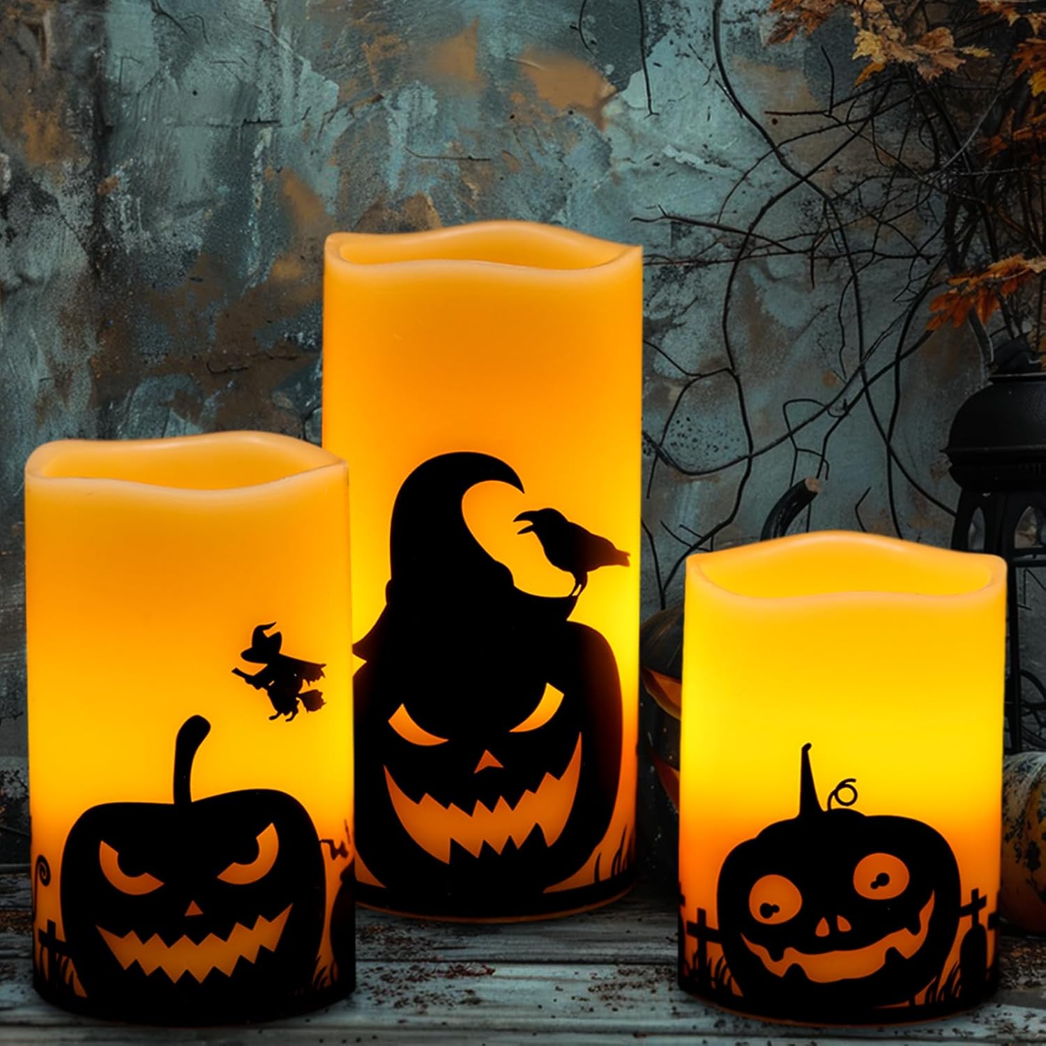 • Package Included: You will receive 3 x LED flameless candles with pumpkin decals (D3" x H 4"5"6"), 1 x user munual, each battery candle is powered by 3AAA batteries (included in the candles). These candles should be stored with batteries removed so as to avoid damaging the fixtures in the bottom of the candles