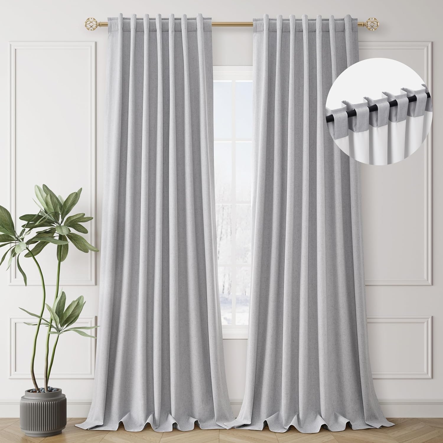 102 Inch Long Linen Curtains Full Blackout Light Grey Room Darkening Window Drapes 2 Panels Back Tab Black Out Noise Reducing Curtains for Modern Farmhouse Living Dining Room Bedroom Light Gray