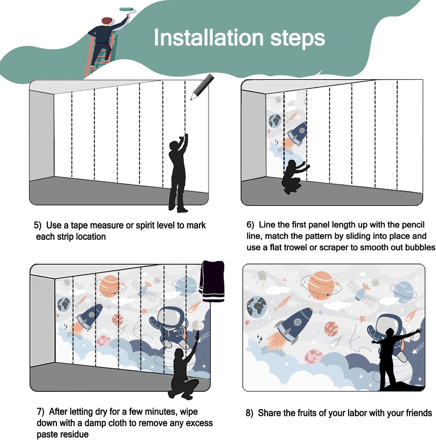 • Mural wallpaper size: 100 "W x 65 "H, divided into 5 sections, each section is labeled with a number underneath, there is no need to overlap the pattern when installing, just install according to the number labeled underneath the panel