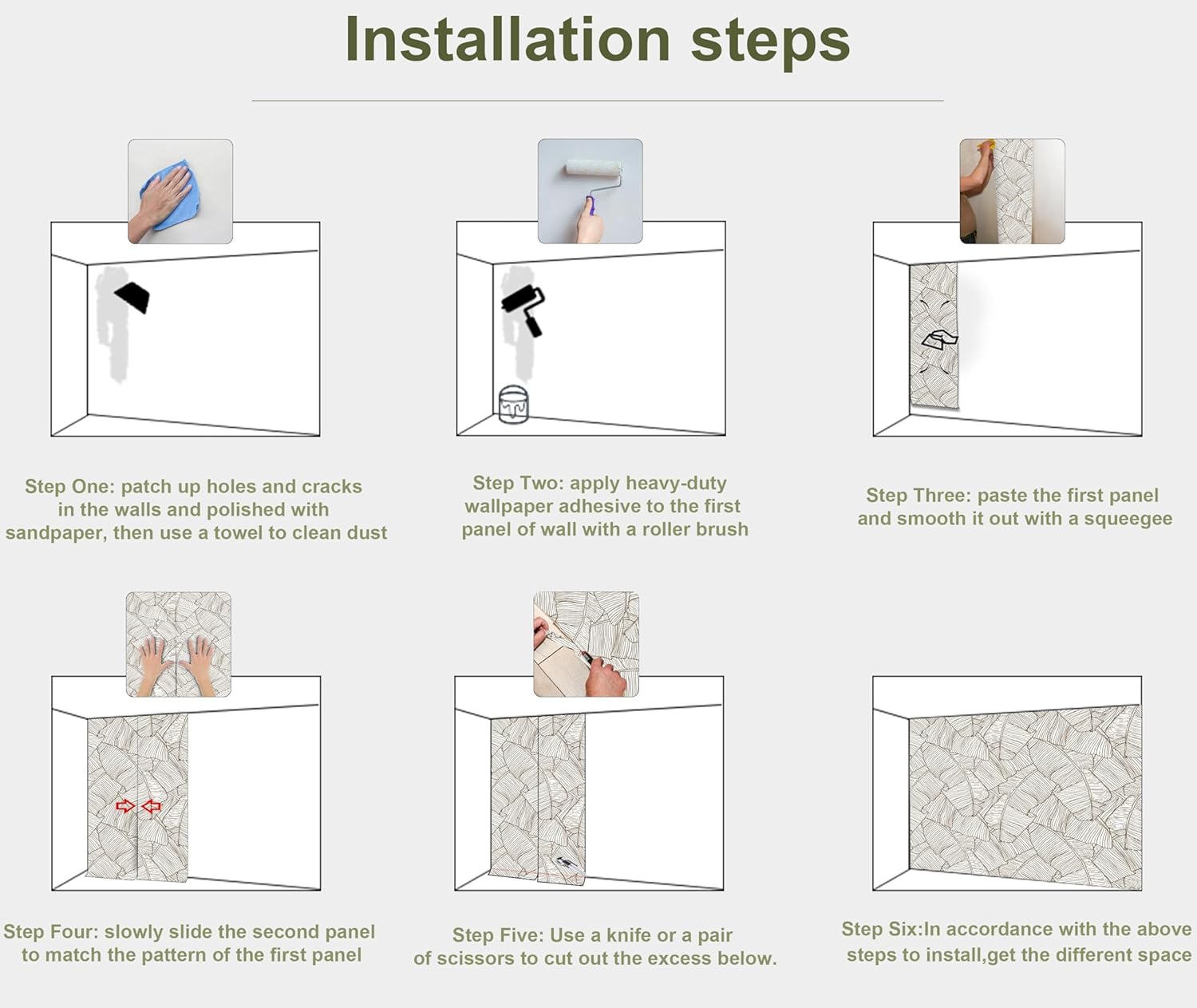 • INSTALLATION - 1.Fill in all cracks or holes and clean dust dirt and grease on the wall surface. 2. Apply the heavy duty wallpaper paste on the wall not mural. 3. Use a spirit level to mark first strip location. 4. match the pattern by sliding into place. 5.use a scraper to smooth out bubbles press. 6. Let dry for a few minutes and that's it! Please Note: Not self-adhesive. We recommend to use a standardized fleece wallpaper paste.