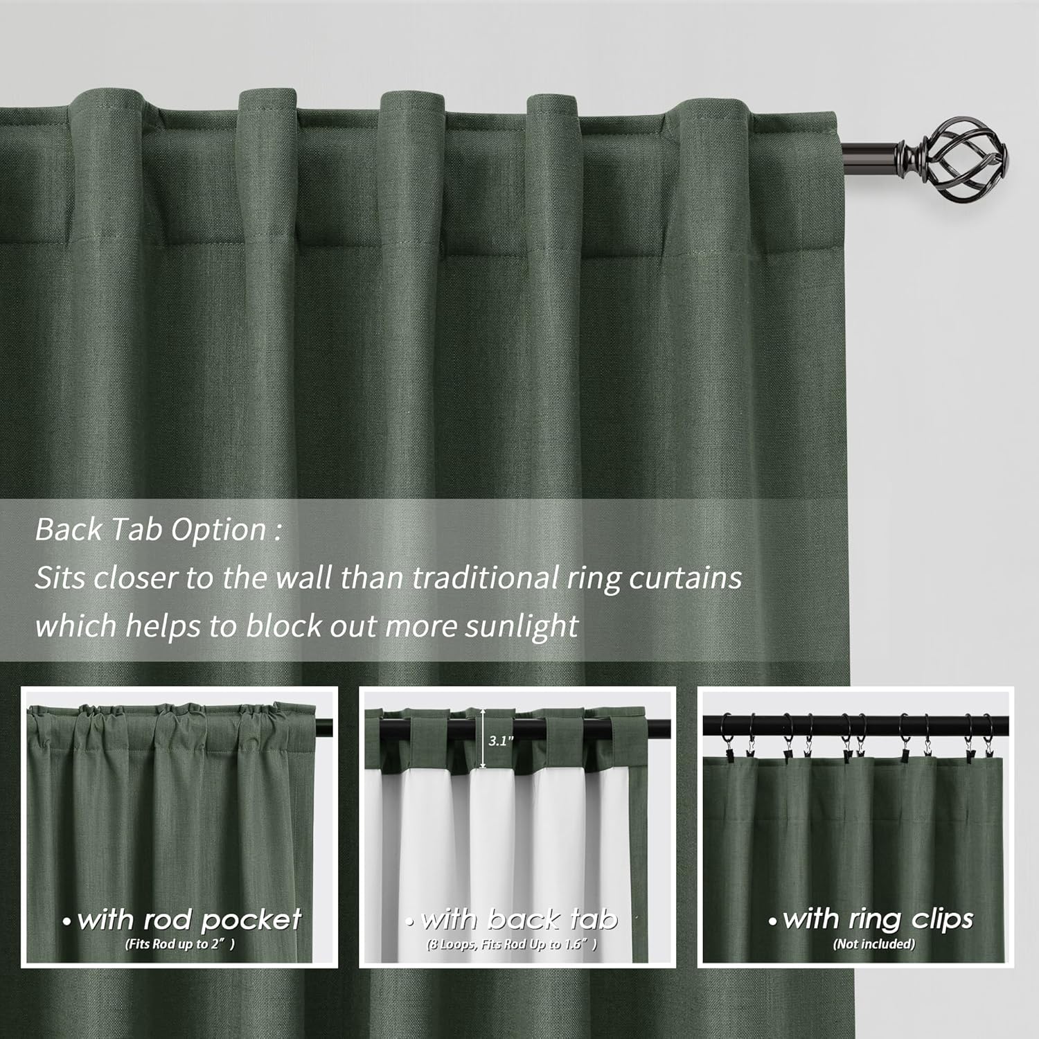 • 3 Hanging Options: Differ from the traditional curtains with grommet, BOODII linen curtains with back tab and rod pocket can full block sunlight fully. (1) Using the back tabs design to create an elegant pleated look and sit closer to the wall than traditional ring curtains, which helps to block out more sunlight; (2) Using rod pocket for a classic effect; (3) Using clip rings on track system or curtain rod, slide open/closed easily (clip rings are not included).