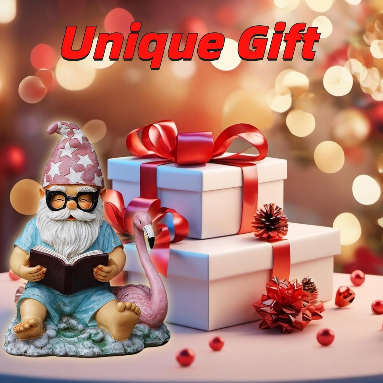 • Unique Appearance Design: This funny statue features a gnome wearing glasses and a pink hat with white stars, engrossed in a book, with an elegant flamingo leaning beside him. This whimsical pairing brings both fun and vibrancy to your garden