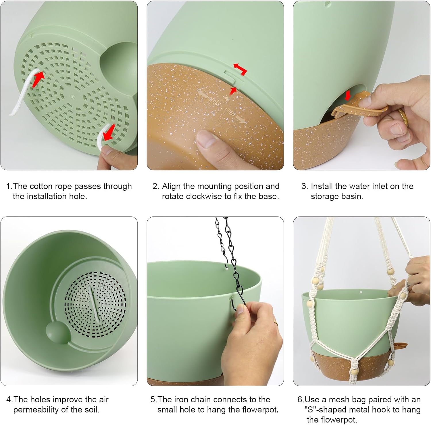 • 【Self-Watering Hanging Planter with Removable Tray】This hanging flower pot comes with a detachable bottom tray that acts as a water reservoir, holding a good amount of water. When your plant needs water, it’s absorbed through cotton wicks from the reservoir to the soil, reducing how often you need to water