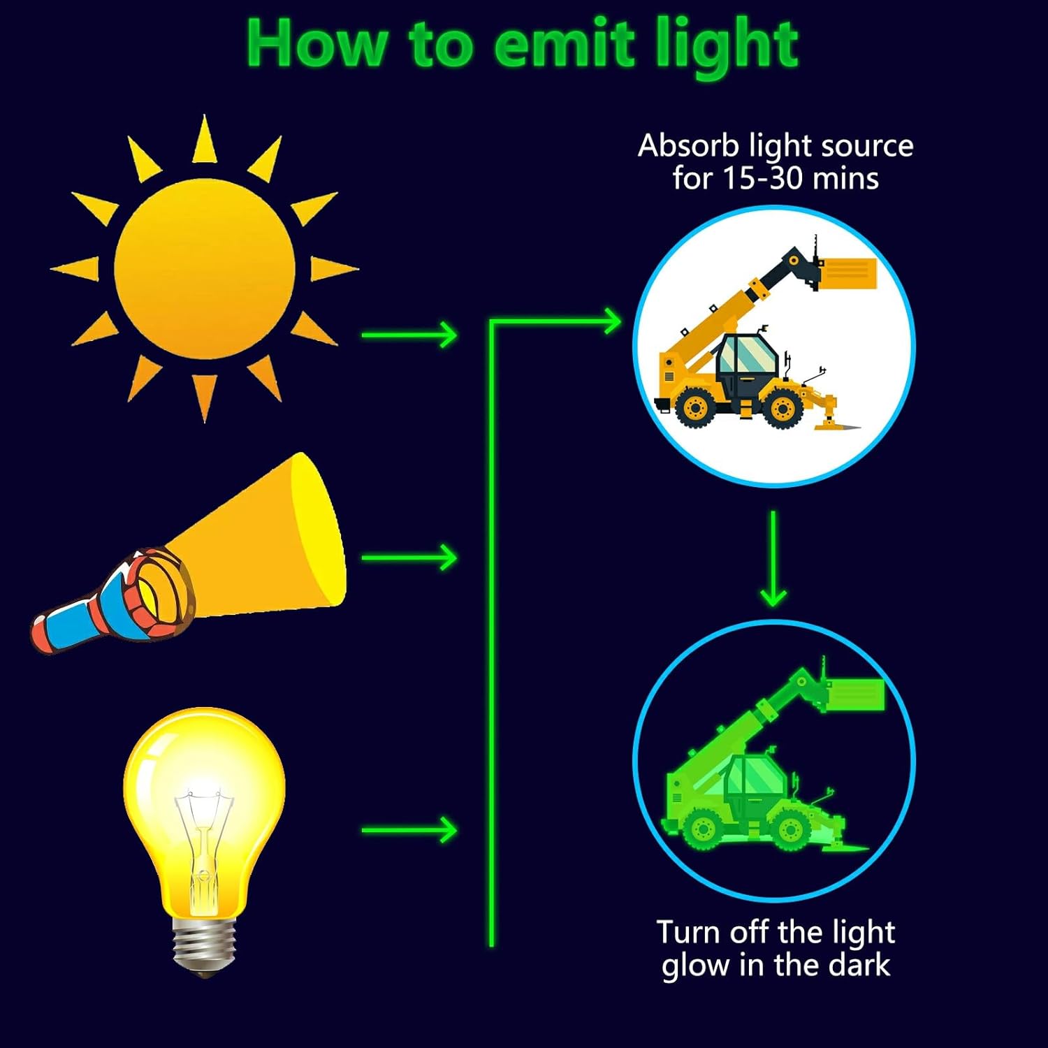 • ✦ Glow Construction Wall Decals: These glow wall decals for ceiling are made of quality luminous material,they will glow brightly when absorb enough light during the day. You just need to put it under lamplight flashlight ,room light or sunshine for 15 minutes, it will keep glowing for 8-10 hours with a gentle green fluorescent light. Please ensure the light shines on the decals without obstruction, the longer it takes to absorb light, then to light up for up to longer.