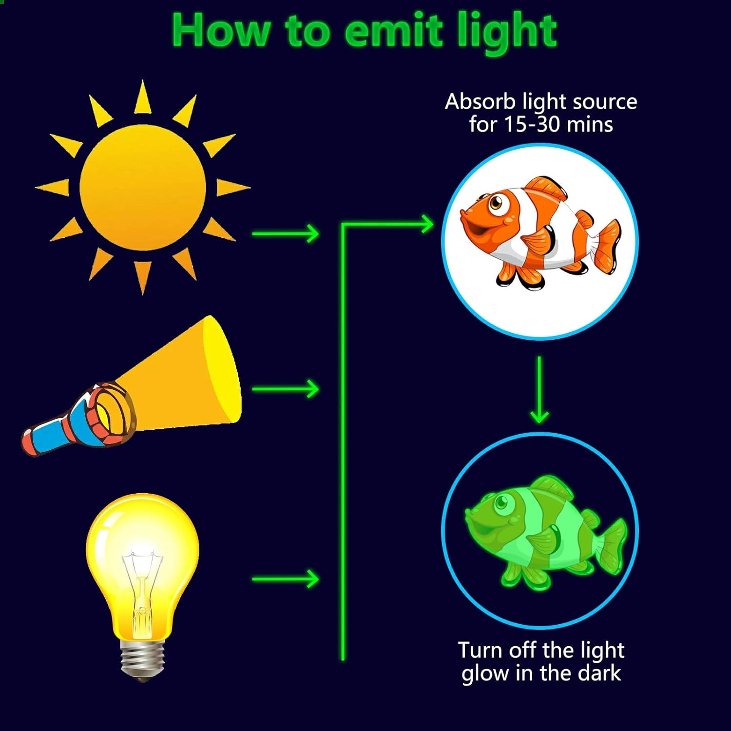 • ✦ Glow Under the Sea Wall Decals: These glow wall decals for ceiling are made of quality luminous material,they will glow brightly when absorb enough light during the day. You just need to put it under lamplight flashlight ,room light or sunshine for 15 minutes, it will keep glowing for 8-10 hours with a gentle green fluorescent light. Please ensure the light shines on the decals without obstruction, the longer it takes to absorb light, then to light up for up to longer.