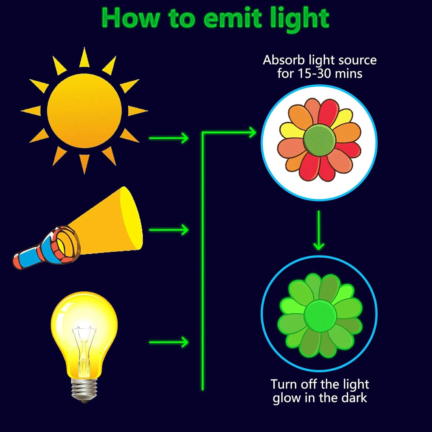 • ✦ Glow Flowers Wall Decals: These glow wall decals for ceiling are made of quality luminous material,they will glow brightly when absorb enough light during the day. You just need to put it under lamplight flashlight ,room light or sunshine for 15 minutes, it will keep glowing for 8-10 hours with a gentle green fluorescent light. Please ensure the light shines on the decals without obstruction, the longer it takes to absorb light, then to light up for up to longer.