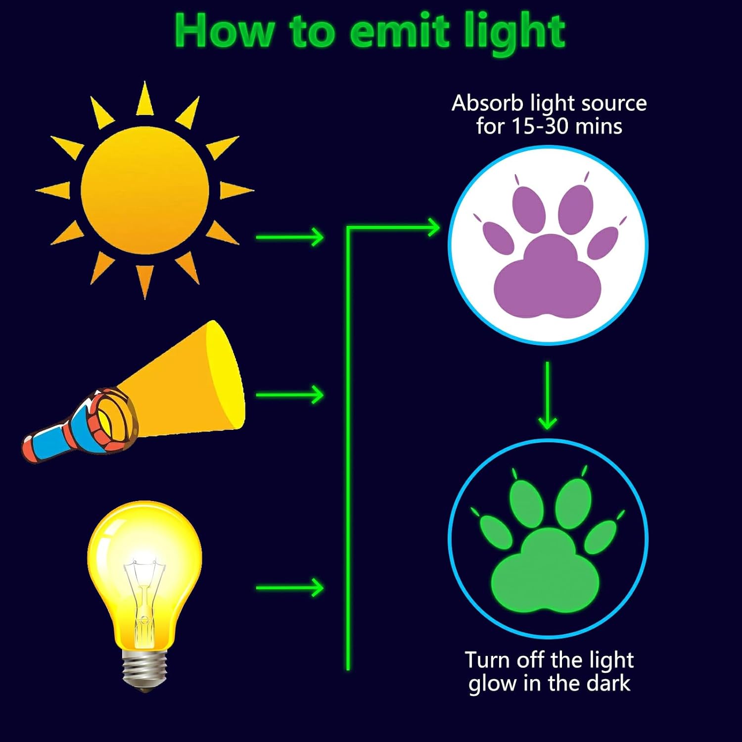 • ✦ Glow Paw Prints Wall Decals: These glow wall decals for ceiling are made of quality luminous material,they will glow brightly when absorb enough light during the day. You just need to put it under lamplight flashlight ,room light or sunshine for 15 minutes, it will keep glowing for 8-10 hours with a gentle green fluorescent light. Please ensure the light shines on the decals without obstruction, the longer it takes to absorb light, then to light up for up to longer.