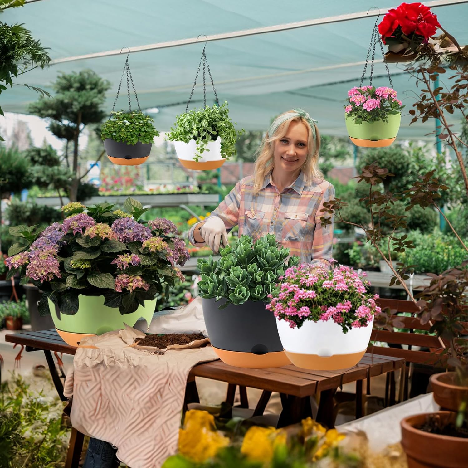 • 【Ventilation and Drainage】The bottom of the planter has a porous design for proper ventilation and drainage. for effective drainage and ventilation. This, combined with the mesh-like structure at the base of the 10 inch self-watering hanging pots, ensures optimal aeration. Suitable for plastic hanging baskets for plants, this design promotes well plant respiration.