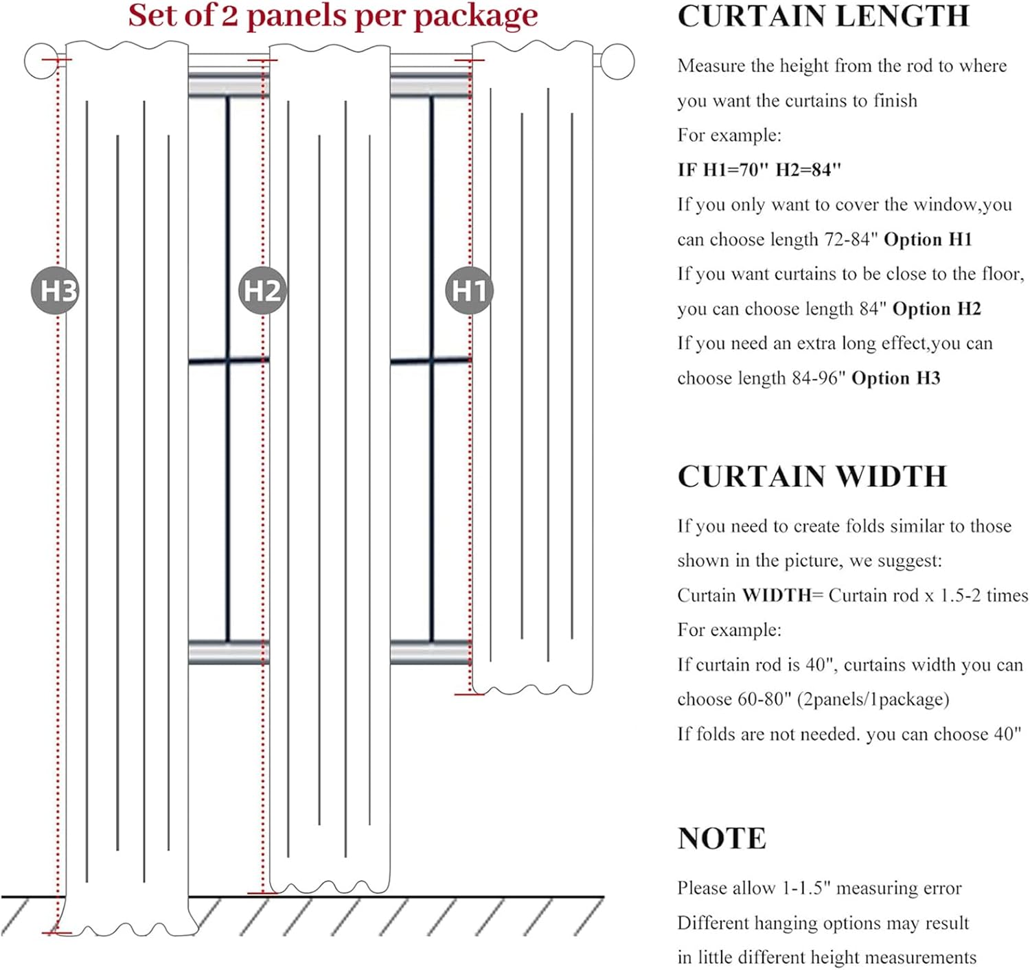 • Ready Made:Set of 2 pinch pleated curtain panels per package with 24 metal rings and 24 adjustable plastic hooks(The adjustable hook can raise and lower the height of the curtain by 1 inch),Each panel measures 70"W x 84"L,pair measures 140"W x 84"L