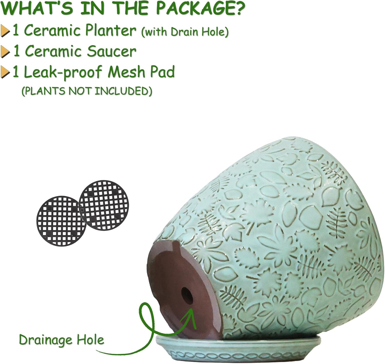 • Size & Package: 10 Inch Pot . Package: contains 1 ceramic flower pots, 1pcs mesh pads and 1pcs saucers(NOT INCLUDE PLANTS)