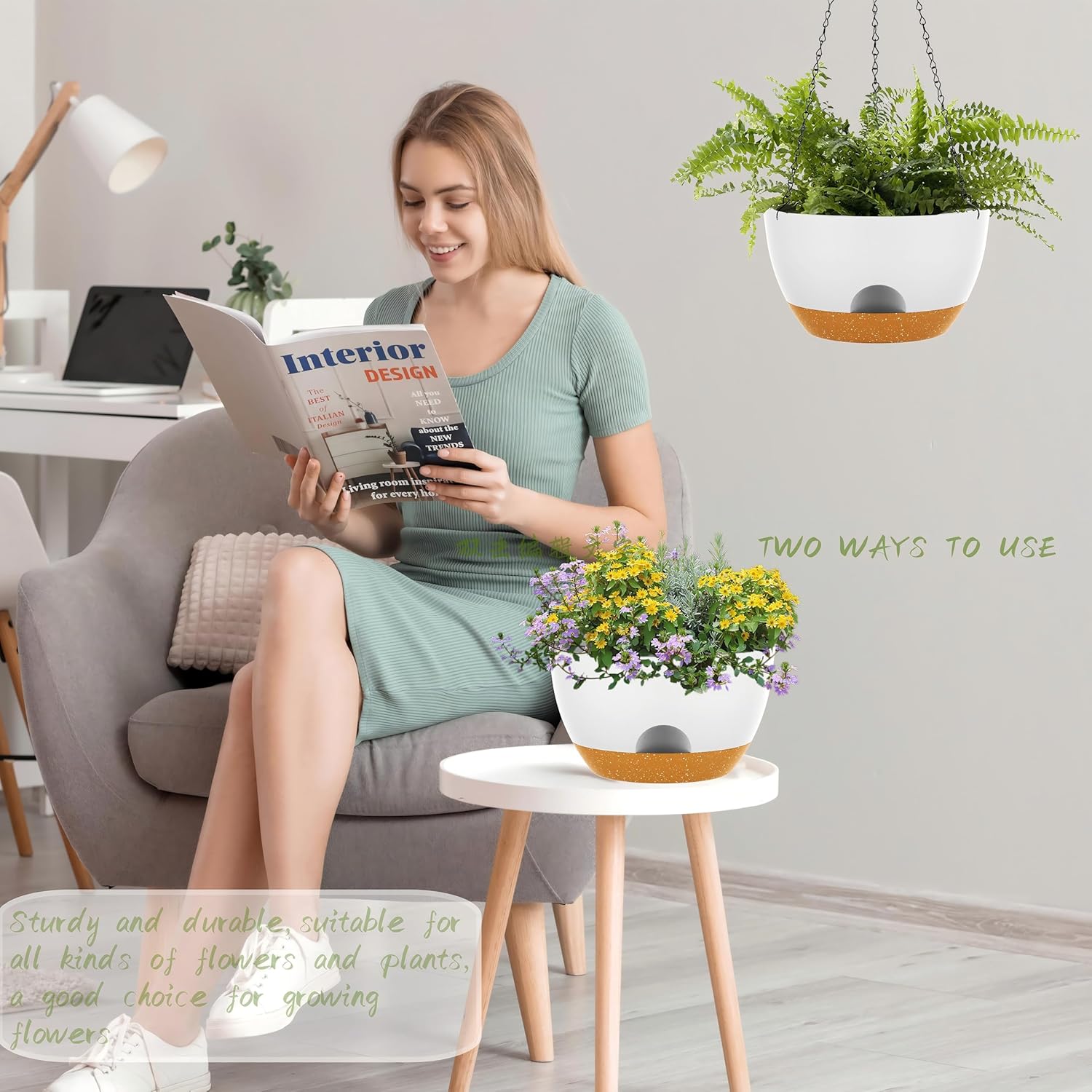 • 【Self-Watering Hanging Flower Pots with Removable Saucer】the appearance and structural design of the Hanging Pot prevents overwatering and acts as a water reservoir to promote Plant growth. It is suitable for a variety of Hanging Pot Plants, such as ivy, Herbs, Ferns, Philodendrons, Succulents, Flowers or other Plants