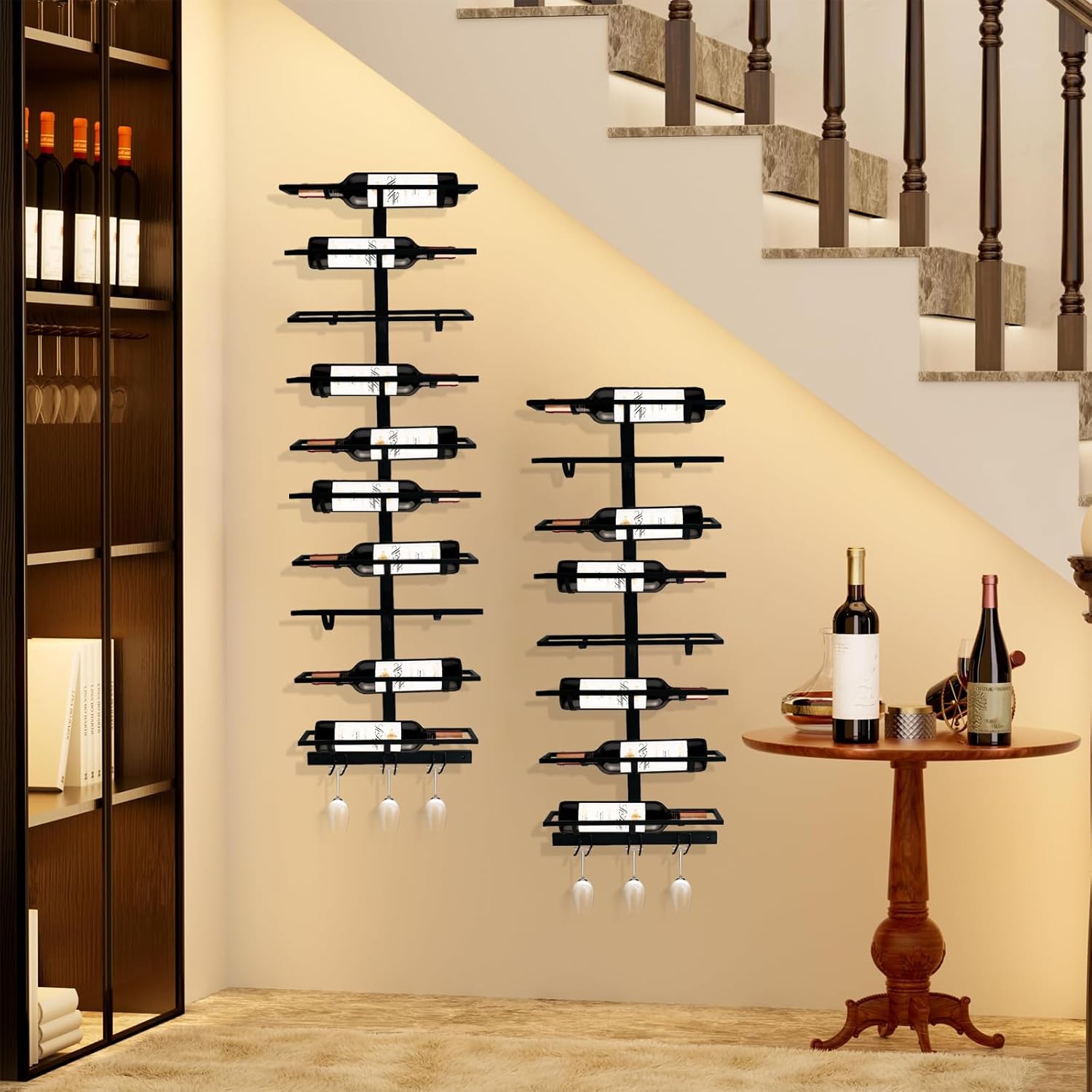 • Prevents Bottles from Falling: The wine glass rack wall mounted comes with a bottom bracket that is 0.5in/1.3cm wide, and each tier of wine shelf is supported by three bottom brackets to ensure that large and small bottles can be placed safely and attractively